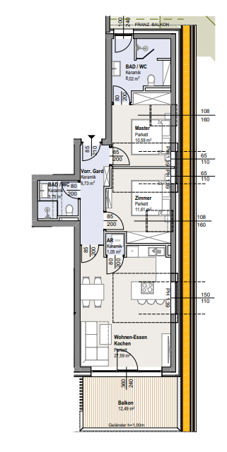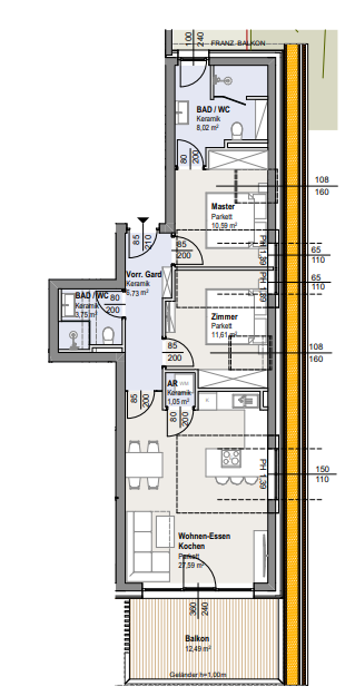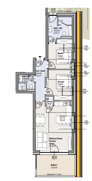 - Apartments with 2 to 4 rooms (44 m² – 88 m²)